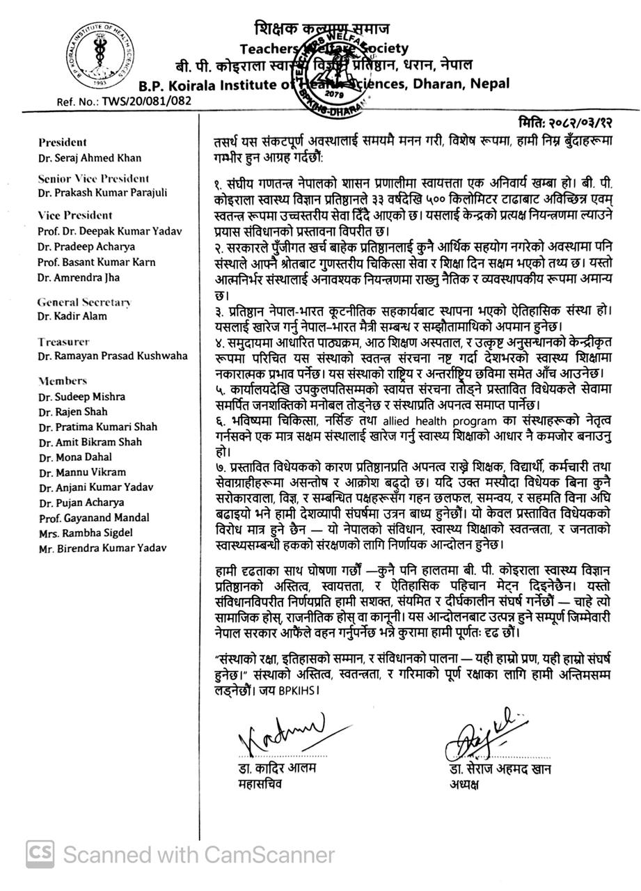 ७. प्रस्तावित विधेयकको कारण प्रतिष्ठानप्रति अपनत्व राख्ने शिक्षक, विद्यार्थी, कर्मचारी तथा सेवाग्राहीहरूमा असन्तोष र आक्रोश बढ्दो छ। यदि उक्त मस्यौदा विधेयक बिना कुनै सरोकारवाला, विज्ञ, र सम्बन्धित पक्षहरूसँग गहन छलफल, समन्वय, र सहमति विना अघि बढाइयो भने हामी देशव्यापी संघर्षमा उत्रन बाध्य हुनेछौं । यो केवल प्रस्तावित विधेयकको विरोध मात्र हुने छैन – यो नेपालको संविधान, स्वास्थ्य शिक्षाको स्वतन्त्रता र जनताको स्वास्थ्यसम्बन्धी हकको संरक्षणको लागि निर्णायक आन्दोलन हुनेछ ।