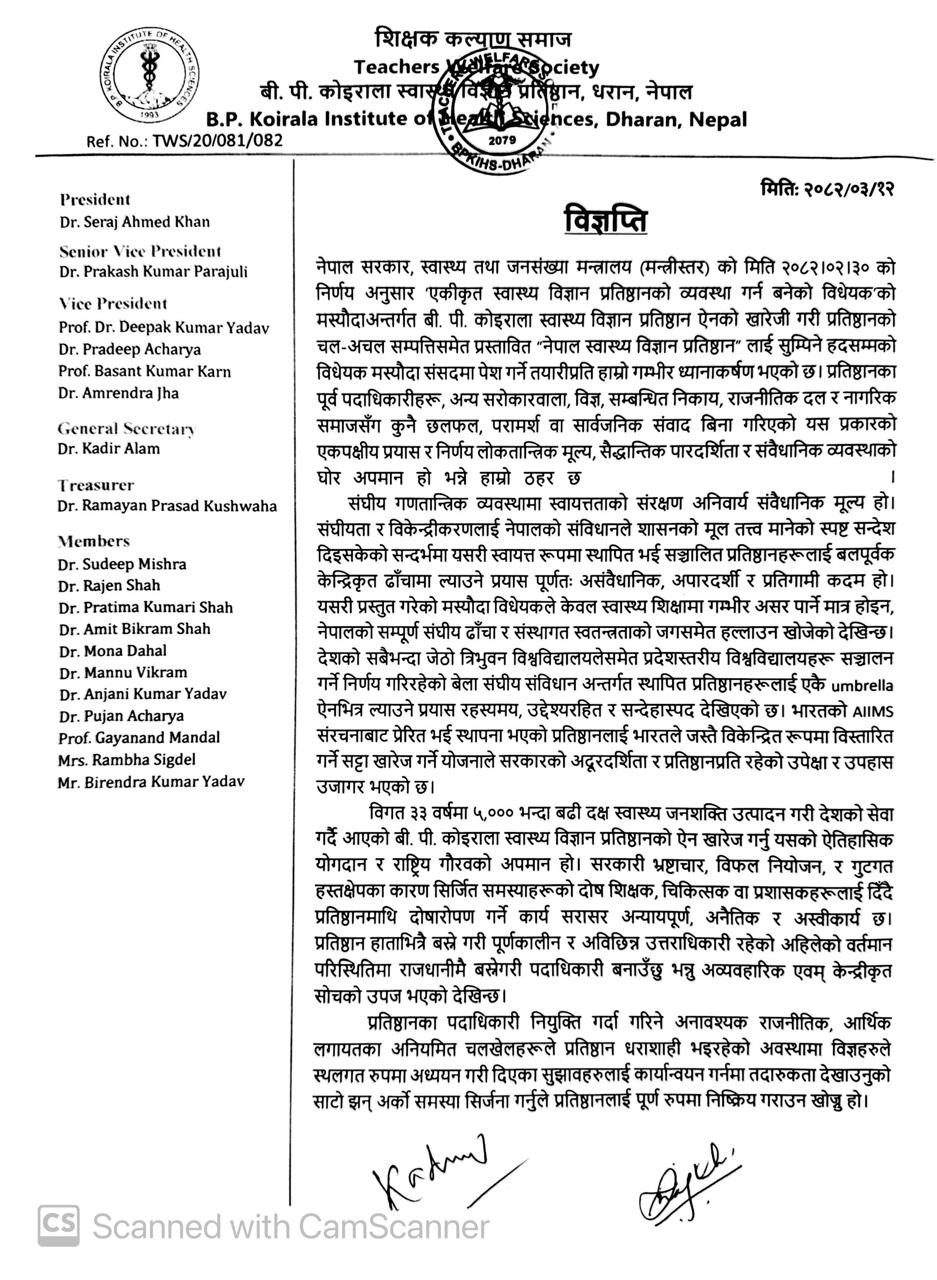 नेपाल सरकार, स्वास्थ्य तथा जनसंख्या मन्त्रालय (मन्त्रीस्तर) को मिति २०८२।०२।३० को निर्णय अनुसार ‘एकीकृत स्वास्थ्य विज्ञान प्रतिष्ठानको व्यवस्था गर्न बनेको विधेयक को मस्यौदाअन्तर्गत बी. पी. कोइराला स्वास्थ्य विज्ञान प्रतिष्ठान ऐनको खारेजी गरी प्रतिष्ठानको चल-अचल सम्पत्तिसमेत प्रस्तावित “नेपाल स्वास्थ्य विज्ञान प्रतिष्ठान” लाई सुम्पिने हदसम्मको विधेयक मस्यौदा संसदमा पेश गर्ने तयारीप्रति हाम्रो गम्भीर ध्यानाकर्षण भएको छ भन्दै बिपी स्वास्थ्य बिज्ञान प्रतिष्ठानका शिक्षक हरुले बिज्ञप्ति मार्फत सम्बन्धित निकायलाई जानकारी गरेका छन्।